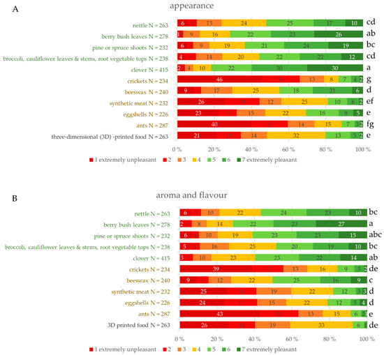 Participants evaluated the pleasantness of the raw materials without any additional information given in the question. The responses to the questionnaire were based on either a recollection of the raw material if the person had previous experience of it or an image if the respondent had no experience of the raw material. Appearances of all the plant-based raw materials were evaluated as more pleasant compared to the raw materials of insect or animal origin apart from beeswax. Additionally, 3D-printed food was seen as less pleasant than plant-based raw materials and beeswax. The appearance of clover and berry bush leaves was the most pleasant (Figure 3A). Most (82%) of the respondents regarded the appearance of clover as at least somewhat pleasant. A proportion (71%) of respondents regarded the appearance of berry bush leaves as at least somewhat pleasant. Pine or spruce shoots, nettle, broccoli and cauliflower leaves and stems and root vegetable tops were regarded as pleasant—over 50% of the respondents evaluated these as at least somewhat pleasant. The appearance of beeswax was evaluated as not pleasant nor unpleasant, but the difference to nettle or broccoli and cauliflower leaves and stems and root vegetable tops was not significant. Eggshells were evaluated as slightly unpleasant; 47% evaluated t as somewhat unpleasant. Synthetic meat and 3D-printed food were also regarded as slightly unpleasant and were not significantly different from eggshells. The 3D printing of food has, to date, been uncommon and it was assumed that most of the consumers had no experience of 3D-printed food. Nevertheless, it was assumed that consumers would have thought food can be printed as any kind of form and therefore the appearance was evaluated as pleasant. This assumption was as discovered false. The appearance of ants was perceived as at least somewhat pleasant by 79% and extremely unpleasant by 40% of the respondents and crickets by 73% and 46%, respectively.