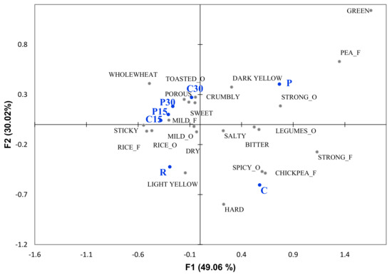 A bi-plot of the products based on sensory descriptive analysis was obtained by means of a correspondence analysis (CA). The CA performed on the total frequency of participants’ counts for each attribute resulted in two dimensions accounting for 79.09% of variance of data. As shown in Figure 1, samples were discriminated according to bran percentages, with all samples containing bran (C15, C30, P15, and P30) positioned in the upper left side of the map well separated from the other samples not containing bran. In the other three quadrants, sample with 100% legumes (C and P) and 100% rice (R) were positioned.