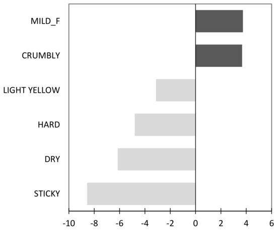 The main sensory attributes that significantly (p < 0.05) influenced consumer hedonic perception are reported in Figure 2. Penalty analysis results revealed that two sensory attributes played a positive influence (drivers of liking: mild flavor and crumbly), and five attributes had a negative influence (drivers of disliking: light-yellow color, hard, dry, and sticky).