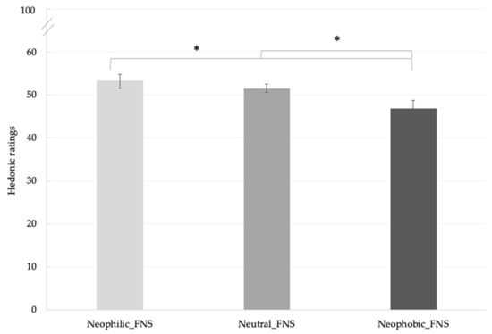 Mean liking scores ± SEM according to food neophobia levels. * p < 0.05. FNS = Food Neophobia Scale.