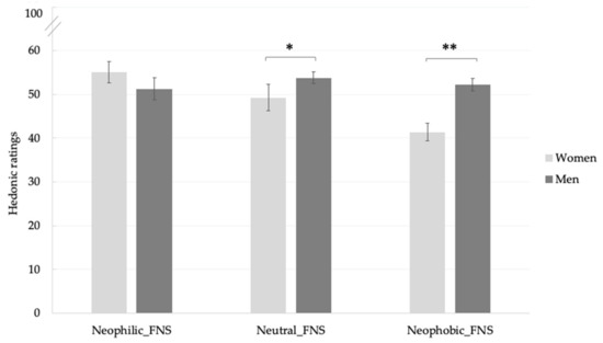 Mean liking scores ± SEM according to food neophobia levels and gender. * p < 0.05; ** p < 0.01. FNS = Food Neophobia Scale.