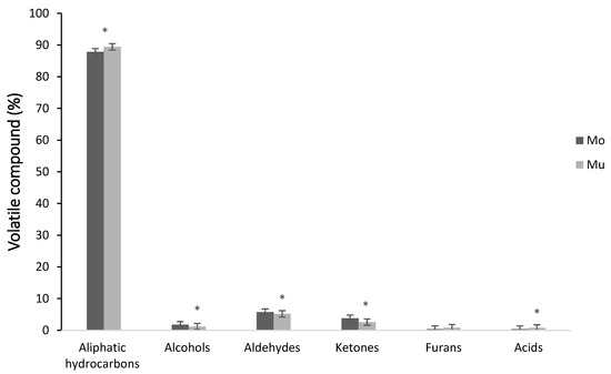 Volatile compounds of monolayered (Mo) and multilayered (Mu) fish oil microcapsules classified according to chemical families. Values are expressed as the average percentage of each family. *: significant differences (p < 0.05).