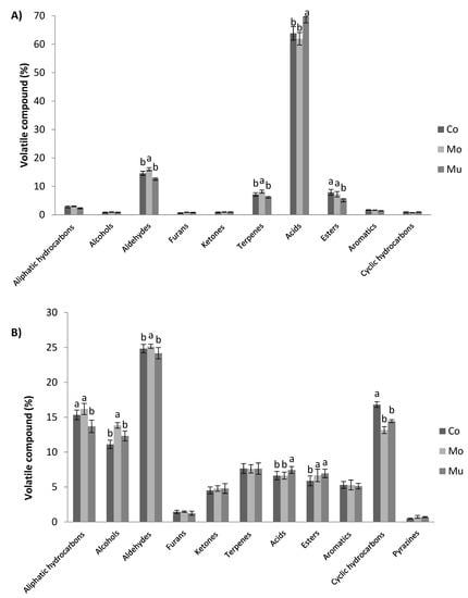 Volatile compounds of dry-cured (A) and cooked (B) sausages as affected by enrichment with omega-3 polyunsaturated fatty acids (ω-3 PUFA) (control: dark gray; enriched with multilayered fish oil microcapsules: medium gray; enriched monolayered fish oil microcapsules: light gray) classified according to chemical families. Values are expressed as the average percentage of each family. Bars with different letters (a, b) within the same formulation show significant differences (p < 0.05) due to enrichment effect (Co vs. Mo vs. Mu).
