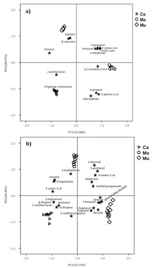 The enrichment effect with Mo and Mu fish oil microcapsules significantly influence the volatile compounds of most chemical groups (Table 2), excluding esters, aromatics and cyclic hydrocarbons. Only 13 in 53 volatile compounds identified in D-SAU showed significant differences among batches: C-SAU-Mo showed higher AU in six volatile compounds (1-propanone, 1-penten-3-ol, 1-octen-3-ol, pentanal, 3,5-octadien-2-one and acetic acid) and lower in one (butanal) in comparison to C-SAU-Co and C-SAU-Mu; C-SAU-Mu obtained higher abundance in two volatile compounds (heptane and β-mycene) and lower in one (3-hydroxy-2-butanone) than in C-SAU-Co and C-SAU-Mo, and C-SAU-Co showed higher AU in one volatile compound (2-penthyl-furan) and lower in two (1-propanol and 2-ethylfuran) in comparison to the enriched batches. Figure 3a represents the score plots of the PCA of volatile compounds data from the D-SAU samples. The first principal component (PC1) comprised 55.48% of the total variance, and the second principal component (PC2) accounted for 29.47%. The score plot indicates a clear differentiation of samples as affected by the addition of fish oil microcapsules: those with high positive PC1 scores (D-SAU-Mo), those with high positive PC2 scores (D-SAU-Mu) and those with high negative PC2 scores (D-SAU-Co). Several volatile compounds (3,5-octadien-2-one, 1-propanol, pentanal, 1-octen-3-ol, 1-penten-3-ol, acetic acid, 2-ethylfuran, 1-propene, allyl sulphide) are located in the right quadrants (upper and lower), which correspond to high positive charges in PC1, associated with D-SAU-Mo batch. On the other hand, there were a few volatile compounds allocated in the PC2: heptane, β-myrcene, and butanal in the left upper quadrant, and 2-pentyl-furan and 3-hydroxy-2-butanone in the left lower quadrant, related to D-SAU-Mu and D-SAU-Co, respectively. Thus, in comparison to C-SAU-Co and C-SAU-Mu, C-SAU-Mo are more related to typical volatiles compounds of fatty acid oxidation, such as 1-propanol, 1-octen-3-ol and pentanal [45], and to characteristic oxidation markers for PUFA oxidation, such as 1-penten-3-ol, 2-ethyl-furan and 3,5-octadien-2-one, which have been previously observed in mayonnaise and chicken nuggets enriched with fish oil [23,48], and are correlated with the strength of the oxidation process [48,50]. The low odor thresholds some of these volatile compounds, such as 1-octen-3-ol and 3,5-octadien-2-one (1 and 0.45 µg kg−1 of oil, respectively) [70,71], would lead to the perception of anomalous odor and/or flavor, which may have a negative impact in the products enriched with Mo. Nevertheless, in a previous study carried out with the D-SAU samples of the present work [28], no significant differences in acceptability were found among Co, Mo and Mu samples. So, the influence of the fish oil microcapsules addition on the profile of volatile compounds does not seem to be reflected in the consumer’s perception of D-SAU.