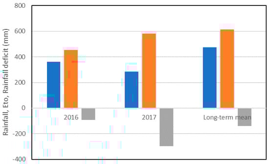 Rainfall (blue bars), reference evapotranspiration (ETo) (orange bars), and rainfall deficit (rainfall–ETo) (grey bars) between October and May for the years 2016 and 2017, plus the long-term mean (40 years; 1970–2010).