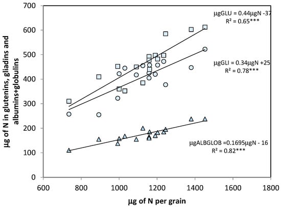 Relationships between the variation in the total grain nitrogen and the N content of the three protein fractions: glutenins (GLU) (squares), gliadins (GLI) (circles), and albumins-globulins (ALBGLOB) (triangles). Points are cultivar means across years and N treatments. *** p ≤ 0.001.