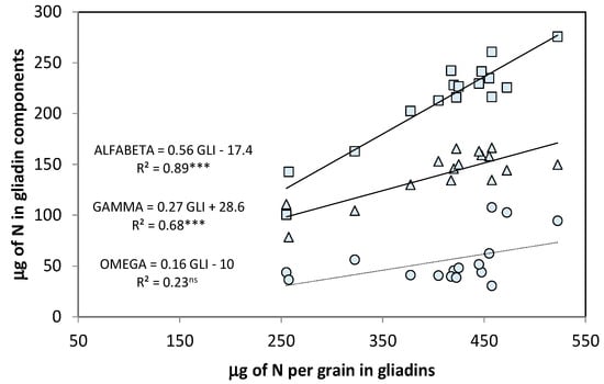 Relationships between the variation in the µg of total gliadins per grain and the content of the three gliadin components: alpha/beta (squares), gamma (triangles), and omega (circles). Points are cultivars means across years and N treatments. ***, p ≤ 0.001; ns, not significant.