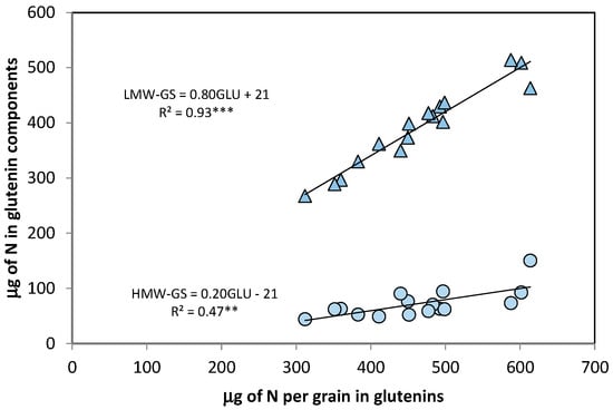 Relationships between the variation in the µg of total glutenins per grain and the amount of the two glutenin components: LMW-GS (triangles) and HMW-GS (circles). Points are cultivar means across years and N treatments. *** p < 0.001, ** p < 0.01.