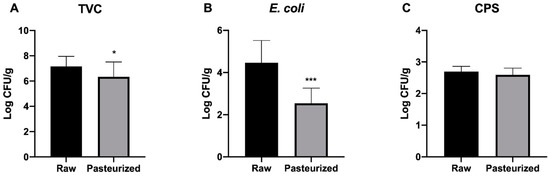 Comparison of TVC, E. coli and CPS counts between raw and pasteurized milk PGI Burrata cheeses. * p < 0.05, *** p < 0.001. (A) TVC, (B) E. coli, (C) CPS.