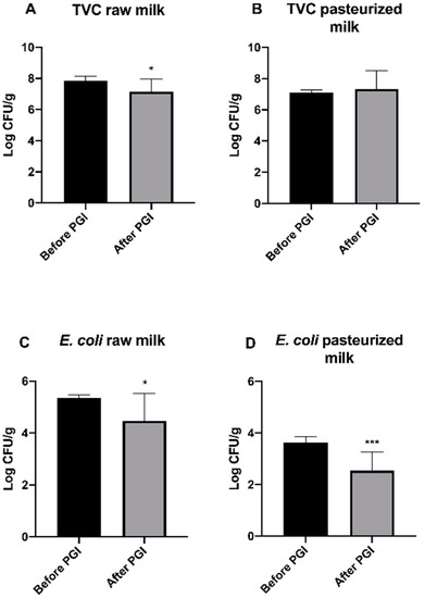 In Figure 1 TVC, E. coli and CPS values from raw (n = 9) and pasteurized (n = 12) milk PGI Burrata cheeses are compared.