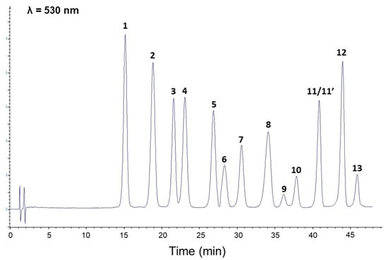 | 12 | Malvidin 3-O-glucoside | 98.3 ± 1.6 | 39.2 ± 1.1 |
