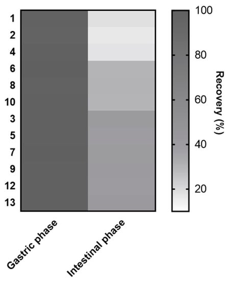 | Peak Number | Compound | Gastric Phase (Recovery, %) | Intestinal Phase (Recovery, %) |