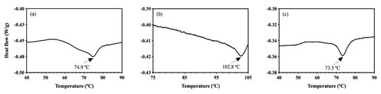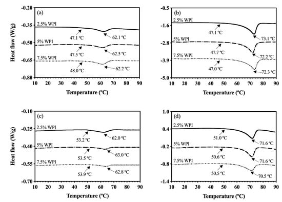 Considering the thermal and mechanical applications in OC and HOC processing and their effects on whey protein structure, it was important to first investigate the effects of these processing conditions in the absence of oleogelation. To begin, different whey protein isolate matrices including a solution (WPI in distilled water), dispersion (WPI in oil), and emulsion (WPI in distilled water + oil) were made and analyzed through DSC. Whey protein solution, depicted in Figure 1a, showed whey protein denaturation temperature at 74.9 °C, which agrees with the findings of Boye et al. [26]. Boye et al. reported a range of denaturation temperatures for β-lactoglobulin (from 72.3 to 82.7 °C) depending on the pH of aqueous solution [26].