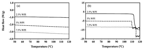 To examine the effects of oleogelation processing on the protein structure, the thermal and mechanical applications required for OC and HOC samples were applied to the CD and CE (OC and HOC formulations with 0% rice bran wax, respectively). As illustrated in Figure 2a, the DSC thermograms of the CDs showed no protein denaturation peak when heated to 120 °C. These results were consistent for all whey protein concentrations (2.5%, 5%, and 7.5% w/w), documenting the whey protein denaturation during the OC processing (shearing and heating at 90 °C).
