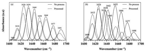 The extent of protein structural changes from the processing was assessed next using FTIR spectroscopy. As depicted in the FTIR spectra in Figure 3a, for samples with 5% protein, the CD samples prepared prior to (the straight line) and post the OC processing (the dotted line) contained various FTIR bands of whey protein within the amide I region, including an amino acid side chain peak around 1606~1608 cm−1, as well as peaks of β-sheet structures ranging from 1615~1638 cm−1 and 1677~1691 cm−1 [37,38]. In addition, FTIR bands of random coils, α-helix, and β-turns were observed around 1644, 1654, and 1665 cm−1, respectively [37,38,39]. Similar observations were seen for the CD samples with 2.5 and 7.5% (w/w) protein. Interestingly, the FTIR spectra of the CD sample processed with the OC processing was quite similar to that of the one without the processing (Figure 3a), highlighting slight structural changes after the OC processing. This is in agreement with the findings from DSC where the whey protein exhibited the enhanced thermal and structural stability due to its hydrophobic interactions with the oil medium (Figure 1b).