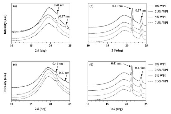 XRD spectra of the colloidal gels prepared with varying WPI and RBW content: (a) the OG (0% WPI) and OCs made with 1% RBW, (b) the OG (0% WPI) and OCs made with 10% RBW, (c) the HOG (0% WPI) and HOCs made with 1% RBW, and (d) the HOG (0% WPI) and HOCs made with 10% RBW.