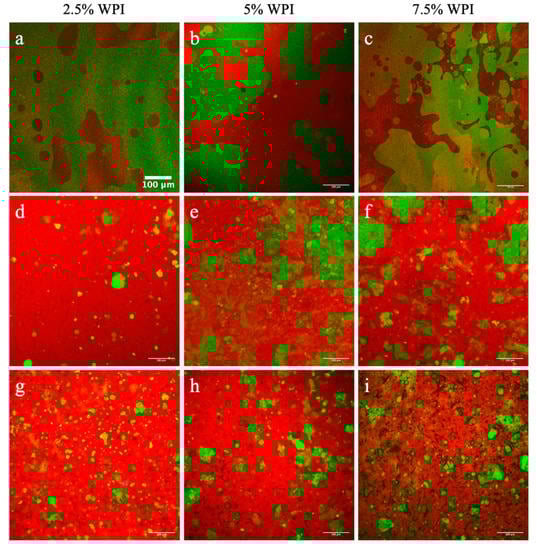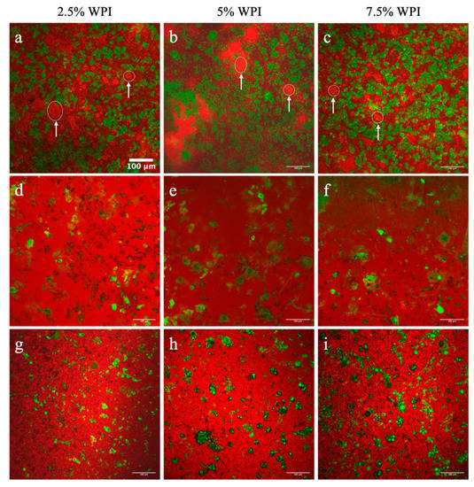 As depicted in Figure 7a–c, the CDs show an oil phase (shown in red) with the whey protein network (shown in green) distributed as large clumps of particles. When the oleogelation took place in the presence of RBW, the OC matrices displayed orderly structured networks. Unlike the CD systems (Figure 7a–c), the continuous lipid phases of the OCs made with 1% RBW (Figure 7d–f) were shown to occupy most of the matrix. Furthermore, the protein networks within the OCs showed small protein aggregates that were evenly distributed throughout the lipid phase. Most notably, the overall network appeared as a solid-like network due to the oleogelation process. Similar observations were documented for the OCs made with 10% RBW as depicted in Figure 7g–i. This finding revealed the role of the oleogelation on the structural integrity of both lipid and protein networks within the developed colloidal gels. These results agree with Bemer et al. [11] who reported that the oleogelation with the RBW in cream cheese products can create a dense network of well-defined protein and lipid globules [11].