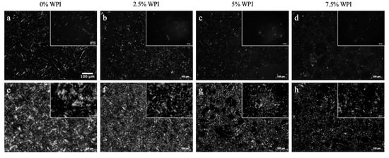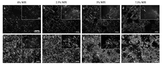 Microstructural images from PLM at the 50× magnification (shown in the in-set images of Figure 9b–d,f–h) of the OCs show that a similar lipid crystal morphology was observed even after incorporating the whey protein. In addition, globular or spherical shapes of the whey proteins were noticeably visible across the OC networks, as indicated by arrows within the in-set images. This result is similar to the work of Bolder et al. [65] who visualized a small amount of whey protein under polarized light in a pH 2 solution [65]. Moreover, as seen in Figure 9b–d,f–h, the greater amount of whey protein appeared to induce denser lipid crystals in the OC networks. The mean particle area of the lipid crystals in the 1% RBW OCs was relatively constant ranging between 15.2 and 16.4 μm2 whereas % fill area increased significantly from 11.2% to 15.1% with more protein content (Table 5). On the contrary, the mean particle area of the lipid crystals in the 10% RBW OCs significantly increased from 42.1 to 59.1 μm2 in the 2.5% and 7.5% (w/w) protein samples, respectively (Table 5). While observing an increment from 47.5% to 50.2% in the % filled area of the lipid crystals in the OCs made with 10% RBW, the increment was found to be insignificant (Table 5). Taking into account that the crystal area and the % filled area of the OG prepared with 1 and 10% RBW were 10.6 μm2 and 8.80% and 40.8 μm2 and 38.0%, respectively (Table 5), these results demonstrated that the lipid crystal networks within the OCs due to the presence of whey protein exhibited a greater density and distribution. However, these results were not consistent with ΔH of melting and SFC of the OCs, both of which decreased with increasing whey protein concentrations from 2.5% to 7.5% (w/w) (Table 4). In other words, the presence of whey protein aggregates in the OC matrix induced clustering of lipid crystals ultimately forming denser crystal networks, rather than promoting lipid crystal content. This result sounds possible considering that the whey protein networks within the OCs were not only well distributed across the lipid networks (Figure 7d–i) but also showed greater particle area with higher protein content (Table 5). While the crystal morphology of the 1 and 10% RBW HOG (shown in Figure 10a,e) was also needle-like, its particle area was 9.55 and 29.8 μm2, which was similar to that of the OG made with 1% RBW (10.6 μm2) but not with 10% RBW (40.8 μm2) (Table 5).