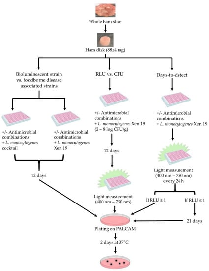 At some time points, hams were destructively sampled with traditional enumeration, after reading the luminescence from the ham, to allow for comparison between RLU and CFU (Figure 1). This was done by aseptically removing the miniature hams from the 96-well plate and suspending 1:10 in PBS in a 1.5 mL Eppendorf tube. The miniature hams were disrupted by vortexing (Vortex-Genie 2, VWR, Rochester, NY, USA) for 5 min to remove the cells from the ham surface, giving recovery that was not statistically different from a stomacher. Additional serial dilutions in PBS were made to the ham solutions. Then 50 µL of the appropriate dilutions were enumerated by plating on Polymyxin Acriflavin Lithium-chloride Ceftazidime Esculin Mannitol (PALCAM) Listeria-Selective agar (EMD-Millipore) with the Listeria selective supplement (EMD-Millipore) in duplicate with a spiral plater (Eddy Jet-Spiral plater, Neutec group inc., Farmingdale, NY, USA) and incubated at 37 °C for 48 h prior to counting with a colony counter (The IUL Flash and Go, Neutec group inc., Farmingdale, NY, USA).