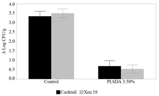 The growth of L. monocytogenes Xen19 was compared to a 5-strain cocktail of L. monocytogenes strains after 12 days using enumeration by plating with no antimicrobial treatment and PLSDA at 3.50% (Figure 2). The change in growth was examined and analyzed with the 12-day end-point plate count (Ni) being subtracted from the starting count at Day 0 (N0). An ANOVA indicated significant statistical differences between hams treated with 3.5% PLSDA and the non-treated ones (p < 0.05), which was to be expected. However, no statistical differences (p = 0.98) were found between hams inoculated with the L. monocytogenes cocktail and the ones inoculated with L. monocytogenes Xen19, nor was the interaction effect significant (p = 0.40).