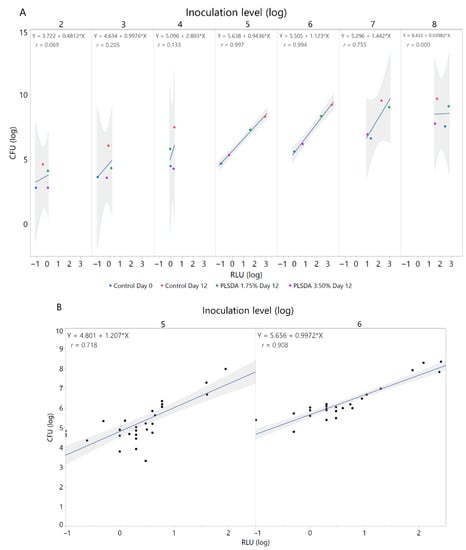 Correlation of CFU and RLU at multiple inoculation levels. The shaded region shows the 95% confidence intervals. (A) Preliminary screening with limited antimicrobials with inoculation levels ranging from 2 to 8 log CFU/g. (B) Additional trials for the inoculation levels with the best initial correlation coefficients (5 and 6 log CFU/g). See text for treatment details.
