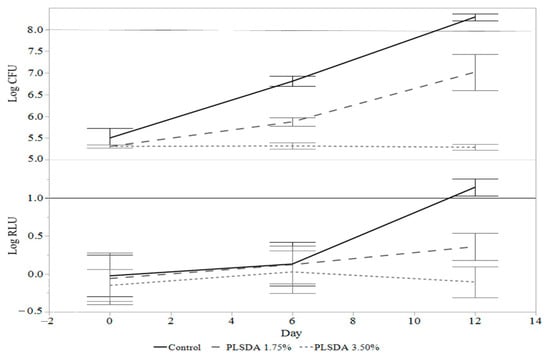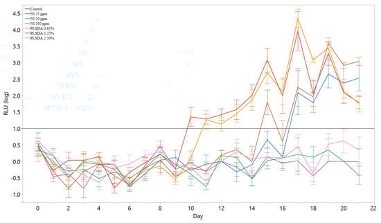 The control was the first to reach the threshold at 10 days, followed by PLSDA at 0.6% at 11 days, PLSDA 1.25% at 15 days, and NI 25 ppm at 17 days (Table 2). An ANOVA test was used to confirm that the treatments that reached 1 log RLU threshold (control, PLSDA 0.6%, PLSDA 1.25%, and NI 25 ppm) were significantly different (p < 0.05) from the treatments that did not reach that threshold (2.5% PLSDA, 50 ppm NI, and 100 ppm NI). Post-hoc analysis using the Tukey-Kramer test determined that the treatments that did not reach the 1 log RLU threshold had significantly different mean plate counts than each other and to the treatments that exceeded the 1 log RLU threshold (p < 0.05). In addition, the mean plate counts at the time point where the treatments first exceeded 1 log RLU were not significantly different (p > 0.05).