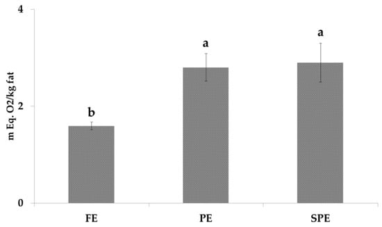 Peroxide value (PV) was determined in order to establish the influence of thermal process on primary lipid oxidation products. As reported in Figure 1, PV increased from fresh to spray-dried products showing 1.59, 2.80 and 2.9 mEq. O2/kg of fat for FE, PE and SPE, respectively. The increment was 1.8 times higher after pasteurization. A different trend was noticed in a previous work [27], where the PV value of spray-dried eggs reached 4.4 mEq. O2/kg of fat. It is assumed that the different conditions used for the spray-drying treatment applied in this trial (lab scale instead of industrial scale) have positively affected the PV value inducing a lower oxidation of the eggs.