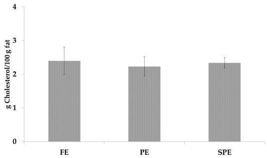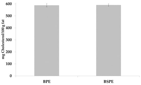Figure 5 reported the cholesterol content in biscuit samples. BPE and BSPE contained 588.7 and 590.8 mg of cholesterol/100 g of fat; these values agreed with the amounts of cholesterol reported in biscuits by Lercker and Rodriguez-Estrada [32].