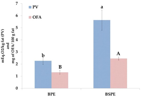 To determine the lipid oxidation of BPE and BSPE samples, peroxide value (PV), oxidize fatty acids (OFA) and COPs were analyzed. Figure 4 shows the PV and OFA values in biscuit samples.