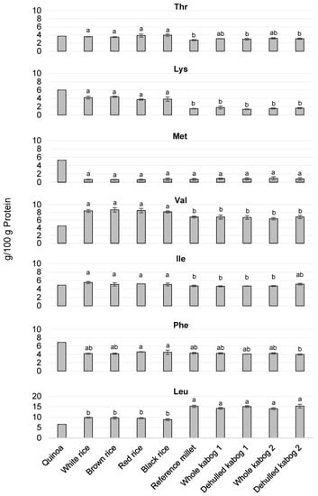Essential amino acid content (g/100 g protein) of rice (white, brown, red, and black), reference millet, and kabog millet (whole and dehulled) samples compared to quinoa []. Kabog millet 1 refers to kabog millet obtained from farmer source 1, and kabog millet 2 refers to kabog millet obtained from farmer source 2. The values followed by the same letters are not significantly different at p < 0.05 using one-way ANOVA Tukey’s HSD.