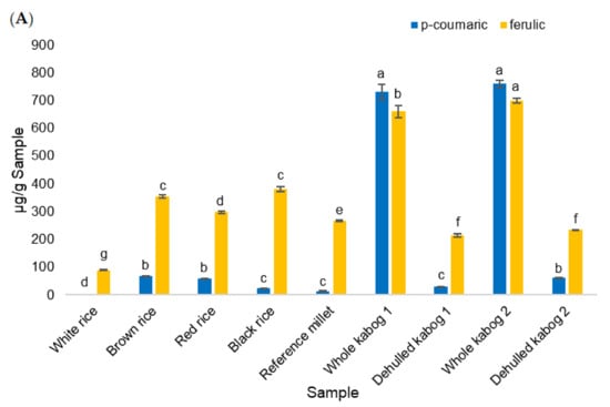 (A) Ferulic and p-coumaric acid content of rice (white, brown, red, and black), reference millet, and kabog millet (whole and dehulled) samples. (B) Individual phenolic acid content (µg/g sample) of rice (white, brown, red, and black), reference millet, and kabog millet (whole and dehulled) samples, not including p-coumaric and ferulic acids. Values with the same letters are not significantly different at p < 0.05 using one-way ANOVA Tukey’s HSD.