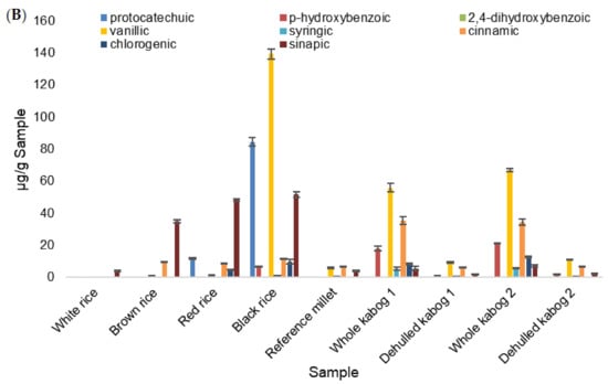 For the individual phenolic acids, the whole kabog millet samples contained the highest amounts of p-coumaric and ferulic acids. In whole kabog millet 1, the amounts of p-coumaric and ferulic acids were 731 ± 28 and 660 ± 21 µg/g sample, respectively, while the amounts of p-coumaric and ferulic acids from sample 2 were 760 ± 13 and 699 ± 9 µg/g sample, respectively. Dehulled kabog millet 1 and 2 contained significantly higher amounts of p-coumaric acid (31 ± 1 µg/g and 62 ± 0 µg/g, respectively) than the reference millet (13 ± 1 µg/g) and white rice (undetected) (Figure 3A). The whole kabog millet samples 1 and 2 contained significantly higher amounts of vanillic acid (56 ± 3 µg/g and 67 ± 1 µg/g, respectively) than the reference millet (6 ± 0 µg/g) and white rice (undetected) (p < 0.05). The same trend was observed for cinnamic acid, with the whole kabog millet samples 1 and 2 having (35 ± 2 µg/g and 34 ± 2 µg/g, respectively) significantly higher amounts than the reference millet (6 ± 0 µg/g) and white rice (undetected) (p < 0.05). On the other hand, black rice had the highest amount of protocatechuic and vanillic acids (84 ± 3 and 139 ± 3 µg/g sample, respectively). White rice contained 90 ± 2 µg/g ferulic acid and 4 ± 0 µg/g sinapic acid (Figure 3B).