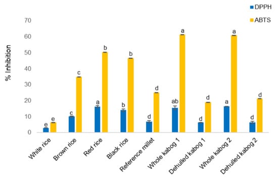 %Inhibition of DPPH (radical scavenging activity, RSA) and ABTS (radical cation scavenging activity) of rice (white, brown, red, and black), reference millet, and kabog millet (whole and dehulled) samples. Values followed by the same letters are not significantly different at p < 0.05 using one-way ANOVA Tukey’s HSD.