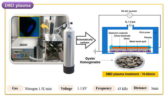 Nevertheless, to our knowledge, there have been few studies on the impact of DBD plasma on shellfish such as oysters, which are often cited as causes of HuNoV food infection. Since HuNoV can also bind to the digestive tissues, including the midgut and digestive diverticulum of oysters [22], we judged homogenates of oyster digestive tissues to be suitable for use in the HuNoV viability study. Therefore, this study’s objective is to characterize the effects of DBD plasma treatment time (10–60 min) on reducing potential HuNoV infectivity in fresh oysters using PMA coupled with RT-qPCR while also monitoring the effects on oyster quality.