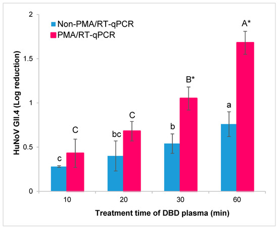 The capital letters (A–C) represent propidium monoazide (PMA) pretreated HuNoV reduction. The lowercase letters (a–c) represent non-PMA pretreated HuNoV reduction. Within each DBD plasma treatment time, log reduction means with different letters (a–c or A–C) differ significantly (p < 0.05) by Duncan’s multiple range test. Asterisks (*) also indicate a significant difference (p < 0.05) between non-PMA- and PMA-treated samples DBD plasma treated for >30 min by paired t-test.