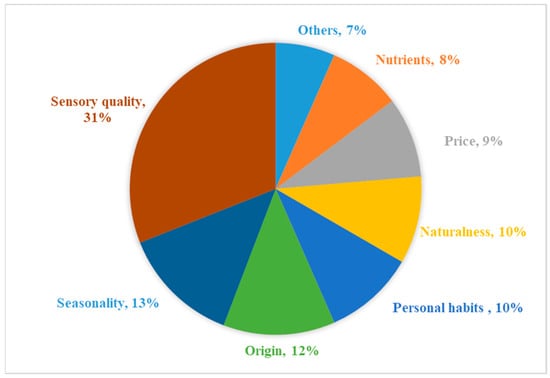 The factors can be summarized into three major categories: (1) internal product features, such as sensory quality (31%), seasonality (13%), origin (12%), naturalness (10%) and nutritional value (8%); (2) external product features; and (3) personal habits and individual needs of consumers.
