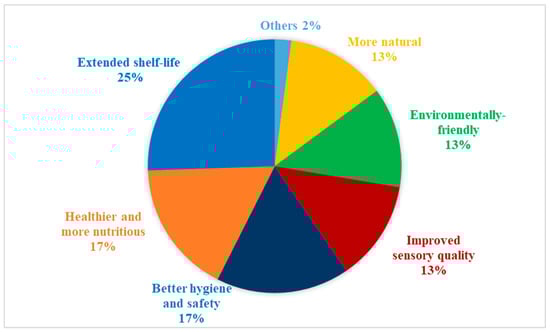 However, as illustrated in Figure 3, the extension of shelf-life in a “less invasive” way (25%) was one of the most important benefits expected by participants, compared to conventional processing. Moreover, they expressed positive expectations for the potential effect of NTP in the reduction of food waste due to the extended shelf-life, which could possibly enhance their interest in non-thermally processed products: