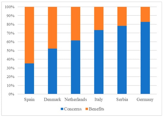 Relative frequency (%) of concerns and expected benefits stated by young (18–35) and middle-aged (45–60) participants in all countries.