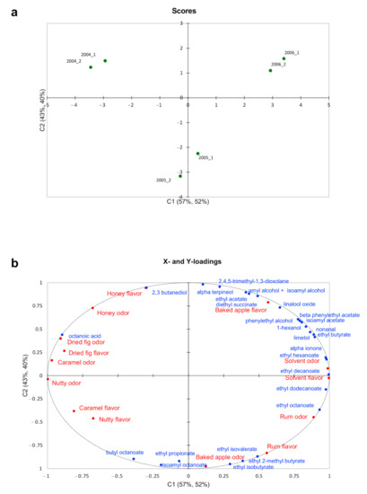 The positioning of the Vin Santo vintages in the two replicates is reported in the Scores plot (Figure 1a), whereas the relation between sensory data (red font) and volatile compounds (blue font) is reported in the Loadings plot (Figure 1b).