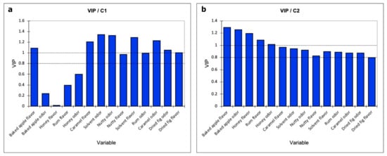 On the basis of the data obtained by PLS modeling, variable importance in projection (VIP) was used to extract the most relevant volatile compounds for each sensory attribute (See supplementary Table S1). VIP results from a weighted sum of squares of the PLS-loadings, and it is related to the amount of explained Y-variable in each dimension. Figure 2 reported the VIP indices associated with a PLS model comprised of the first two components, allowing the identification of the explanatory variables that contribute the most to the model. The analysis showed that the baked apple odor, honey flavor, and odor, and rum flavor have low VIP indices (smaller than 0.8) on C1 (Figure 2a). Nevertheless, looking at the VIP indices on the second component all the variables show a great influence (Figure 2b).