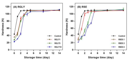 Changes in hardness of rice cakes with glycerol (A) or sucrose fatty acid ester (B) during retrogradation. RGLY: rice cakes with glycerol; RSE: rice cakes with sucrose fatty acid ester.