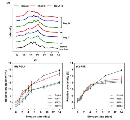 Figure 2B,C showed the relative crystallinity change of RGLY and RSE during storage. The relative crystallinity of rice cake was greatly influenced by type and concentration of additive. GLY lowered the overall relative crystallinity of rice cake (Figure 2B). On the other hand, SE did not affect the relative crystallinity of rice cake for up to 5 days and lowered it after then (Figure 2C). Both GLY and SE interacted with starch and water molecules and retarded the recrystallization in different ways. GLY acts as a plasticizer, which interferes with the hydrogen bonding between starch and water molecules, resulting in an overall inhibition of recrystallization. In the case of SE, it appears that the inhibition of recrystallization is prominent in the later period as the amylose or amylopectin–lipid complex gradually forms. As shown in Figure 2A, RSE clearly formed the amylose–lipid or amylopectin–lipid complex during storage, consequently retarding the recrystallization of rice cake.