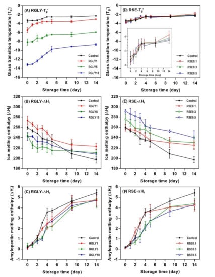 Changes in glass transition temperature (Tg’), ice melting enthalpy (ΔHi), and amylopectin melting enthalpy (ΔHr) of rice cakes with glycerol (A–C) and sucrose fatty acid ester (D–F) during retrogradation, respectively.