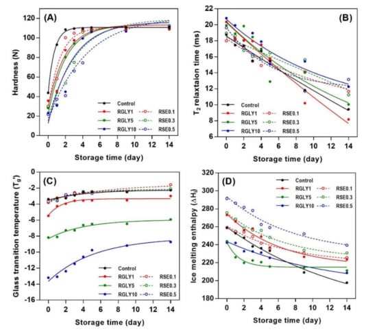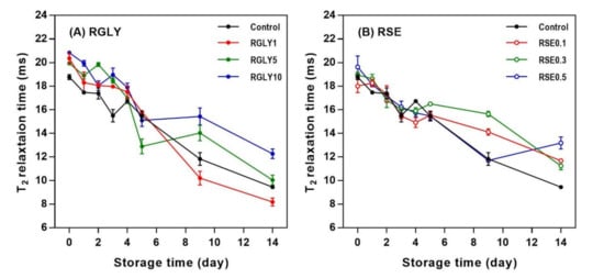 Figure 4 presents the changes in 1H NMR transverse relaxation time (T2) of RGLY and RSE during storage. The low-magnetic-field 1H NMR is the most common NMR technique to investigate the mobility of protons. 1H NMR T2 is known as spin–spin relaxation time or transverse relaxation time, which have long or short relaxation time depending on the immobile/mobile state of the proton [2]. The 1H NMR T2 values of all samples decreased with increasing storage time. This indicated that proton mobility in the rice cake changed from a more mobile state to a less mobile state. As retrogradation proceeds, the disordered state of starch transforms to an ordered state, and water molecules are incorporated into the crystalline lattices, resulting in a decreased mobility of water [33]. It has been reported that pasta containing glycerol (5% and 15% of substitution) has high water mobility because the plasticizing effect of glycerol in pasta matrix increases the flexibility of water molecules [34]. Moreover, the mobility of water decreases or increases depending on the amount of SE in the fresh state, and the T2 decreases gradually during the retrogradation [21]. As such, the decrease in 1H NMR T2 during starch retrogradation is a well-known phenomenon. However, in this study, the addition of GLY slightly increased 1H NMR T2 values in the fresh rice cake, possibly due to the plasticizing effect of glycerol. Similarly, SE also changed the initial 1H NMR T2 values of rice cake. However, the addition of GLY or SE did not retard the decrease in 1H NMR T2 of rice cake during storage. Overall, the addition of GLY and SE was effective in initial 1H NMR T2 values, but their amounts were not enough to retard the decrease in 1H NMR T2 values during retrogradation.