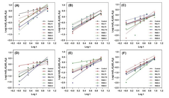 Retrogradation kinetics of rice cakes were investigated using the determined retrogradation properties. The Avrami equation is generally used to investigate the retrogradation kinetics of starch. The retrogradation rate constant (k), Avrami exponent (n), and coefficient of determination (R2) can be obtained from the Avrami equation. Before determining the k or n, the results obtained from macro-, micro-, and molecular-level retrogradation properties were assessed to determine whether the Avrami equation could be applied to the results. Figure 5 shows the result of substituting the Equation (1) in Section 2.7, and the R2 values are shown in Table 1. The classic retrogradation index, such as XRD and ΔHr, is well suited to the Avrami equation for measuring the retrogradation kinetics of starch with relatively high R2 values from 0.94 to 0.99. Hardness, Tg’, and ΔHi showed a relatively wider range of R2 from 0.81 to 0.96, suggesting that fitting the results to the Avrami equation is possible in this case, because they followed the classic retrogradation index. On the other hand, the T2 revealed a lower and wider range of R2 than that of classic retrogradation index, from 0.48 to 0.82. This indicates that the determination of retrogradation kinetics using the Avrami equation is not suitable in this case. In the case in which the application of the Avrami equation is inappropriate, empirical modelling can be used to deduct the retrogradation kinetics of starch in complex starch systems [35].