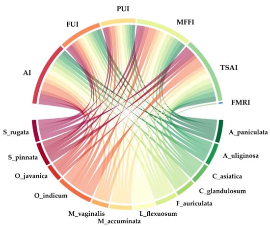 The relationship between twelve leafy vegetable species and the elements of CFSI in two Karen and two Lawa villages in northern Thailand. (AI = availability index; FUI = frequency of utilization index; PUI = plant parts used index; MFFI = multi-functional food use index; TSAI = taste score appreciation index; and FMRI = food-medicinal role index). The thicker the band, the more informants mentioned the relationship.