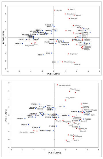 Principal component analysis (PCA) biplots (PC1, PC2, and PC3) of novel sorghum lines, normal sorghum types, and teff and their injera quality attributes of freshly prepared injera (0), and injera stored for 2 days (2) and 4 days (4) at 5 °C. NWND, non-waxy-normal protein digestibility; NWHD, non-waxy-high protein digestibility; hWND, heterowaxy-normal protein digestibility; WND1, WND2, and WND3, waxy-normal protein digestibility lines 1, 2, and 3; WHD1 and WHD2, waxy-high protein digestibility lines 1 and 2; wNTS, white non-tannin sorghum; RNTS, red non-tannin sorghum; RTS, red tannin sorghum; ar, aroma; fl, flavor; aft, aftertaste.