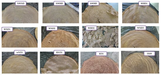 The sorghum lines exhibited a wide range of starch amylopectin contents (Table 2). The five waxy sorghum lines (WND1, WND2, WND3, WHD1, and WHD2) had starch amylopectin contents, ranging between 87.9 and 94.1%. All the other six sorghums had lower starch amylopectin contents (75.6–85.4%), indicating that they were non-waxy and heterowaxy sorghum types []. The starch amylopectin of the teff variety was 77.6%, showing that it was non-waxy. There was no significant difference in starch content (p ≥ 0.05) between the flours of the 11 sorghum lines, nor did they differ from the teff. The starch content of the novel sorghum line flours was, however, slightly higher than their grains (73.0–78.5%), as reported by []. This is because of bran removal when milling to the 84–86% extraction rate as starch is located in the starchy endosperm. The protein content of the sorghum flours varied somewhat, from 11.2 to 13.5%, within the range of their grains (12.0–13.8%) [] and of waxy, heterowaxy, and HD sorghum genotypes studied by [], but generally slightly lower than the teff flour (13.4%). The fat content of the sorghum flours varied quite widely, between 2.6 and 4.6% and was generally higher than the teff, 2.9%, but within the range of the sorghum genotypes []. The ash content of the sorghum flours (1.3–2.2%) was much lower than the teff, because of removal of the mineral-rich bran. As all novel sorghum lines and normal sorghum types were similar in starch and protein contents, the lines were considered to be suitable to study the influences of the waxy and HD traits on their injera making quality.