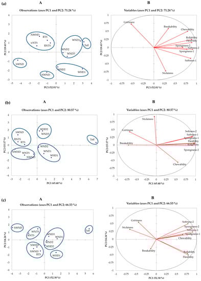 PCA of novel sorghum lines, normal sorghum types, and teff and their injera textural quality attributes of (a) freshly prepared injera, (b) stored injera (2 days at 5 °C), (c) stored injera (4 days at 5 °C); (A) Sorghum line PC scores. NWND, non-waxy-normal protein digestibility; NWHD, non-waxy-high protein digestibility; hWND, heterowaxy-normal protein digestibility; WND1, WND2, and WND3, waxy-normal protein digestibility lines 1, 2, and 3; WHD1 and WHD2, waxy-high protein digestibility lines 1 and 2; wNTS, white non-tannin sorghum; RNTS, red non-tannin sorghum; RTS, red tannin sorghum; (B) Textural attribute PC loadings. Softness-1 (by hand touch), softness-2 (in-mouth sensation), flexibility, rollability, stickiness, sponginess-1 (by hand), sponginess-2 (in-mouth), chewiness, breakability, and grittiness.