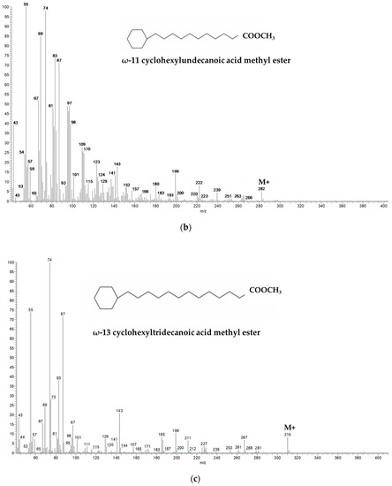 Cyclopropane fatty acids (CPFAs), such as dihydrosterculic and lactobacillic acids, and ω-cyclohexyl fatty acids (CHFAs), such as 11-cyclohexylundecanoic acid (ω-11 CHFA) and 13-cyclohexyltridecanoic acid (ω-13 CHFA), are microbial alicyclic fatty acids that occur in lactic acid bacteria and in rumen microorganisms, respectively [14], and were recently detected in foods of animal origin [18,19,20].